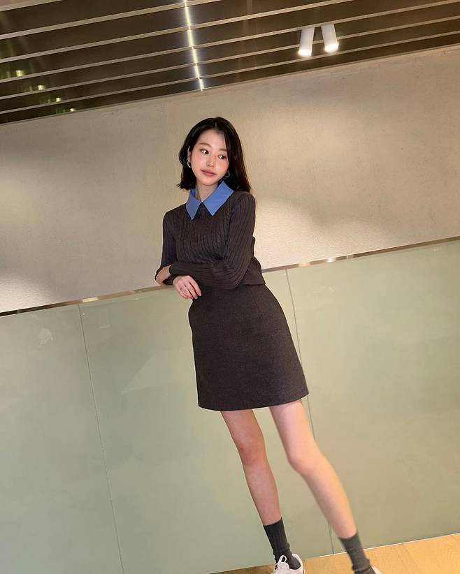 하이웨이스트의 미니 스커트는 자연스럽게 허리선을 올려주고, 다리 라인이 더욱 길어 보이도록 연출해주는 장점이 있어요.