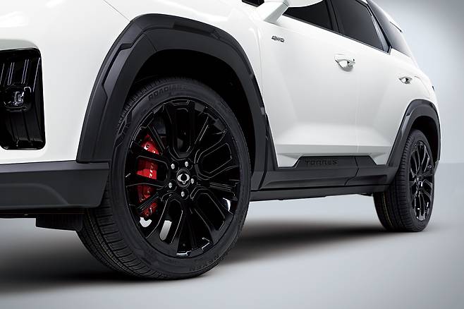 KG 모빌리티가 사전 공개한 ‘토레스 리미티드 블랙 에디션’은 블랙컬러 오브제로 차별화된 스타일링을 엣지있게 완성한 것이 특징이다. 블랙컬러 전/후방 스키드 플레이트 및 C필라 가니쉬, 20인치 다이아몬드 커팅 블랙 휠과 레드 알루미늄 캘리퍼 커버는 스포티하면서도 강인한 이미지를 연출한다.
