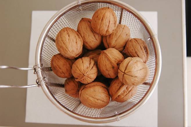 호두는 공기 중에 오래 노출되면 산패되기 쉬우므로 껍질째 보관하다가 드시기 직전에 까서 드시거나 밀폐 용기에 넣어 현관 옆 그늘진 곳에 두고 외출 전 두 알씩 꼭꼭 씹어 드시는 것이 핵심입니다.