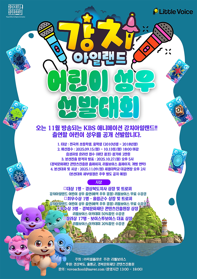 경북문화재단 콘텐츠진흥원은 픽셀플레넷이 제작 중인 TV 애니메이션 '강치아일랜드 시즌2'에 출연할 어린이 성우를 전국 대회로 선발한다고 오늘(27일) 밝혔습니다.