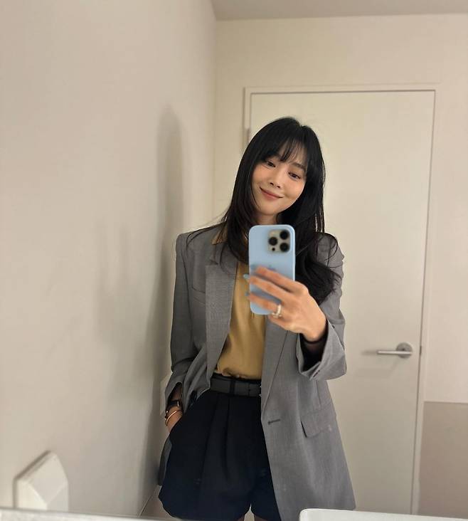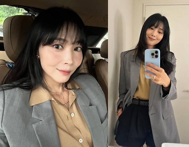 오윤아는 그레이 컬러의 오버사이즈 재킷과 블랙 쇼츠를 매치하여 시크한 매력을 더했습니다.