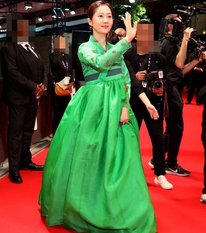 염정아가 입은 의상은 한복의 전통적 요소와 현대적인 디자인이 어우러진 것이 특징이다.