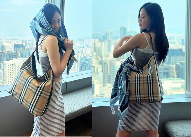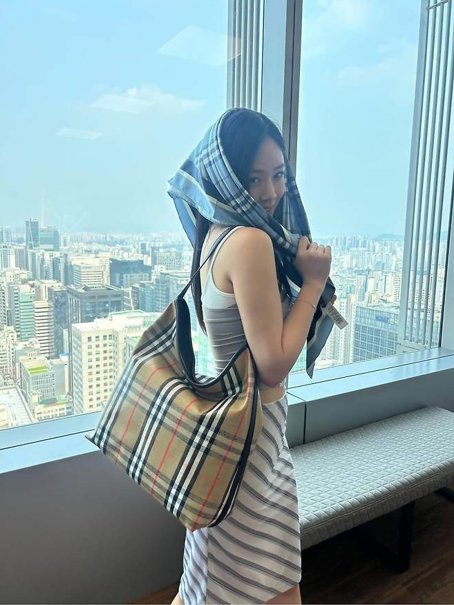 화이트 슬링백 힐과 회색 슬립 탑, 사선 스트라이프 스커트의 조화는 날카로우면서도 우아한 분위기를 완성했고, 체크 패턴이 돋보이는 버버리 토트백으로 클래식한 감성을 더했습니다.