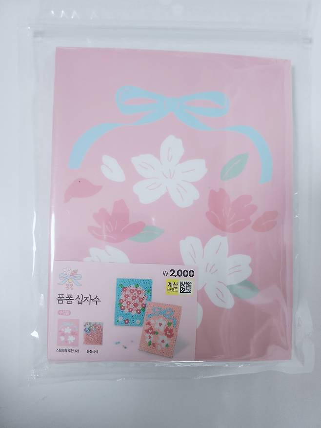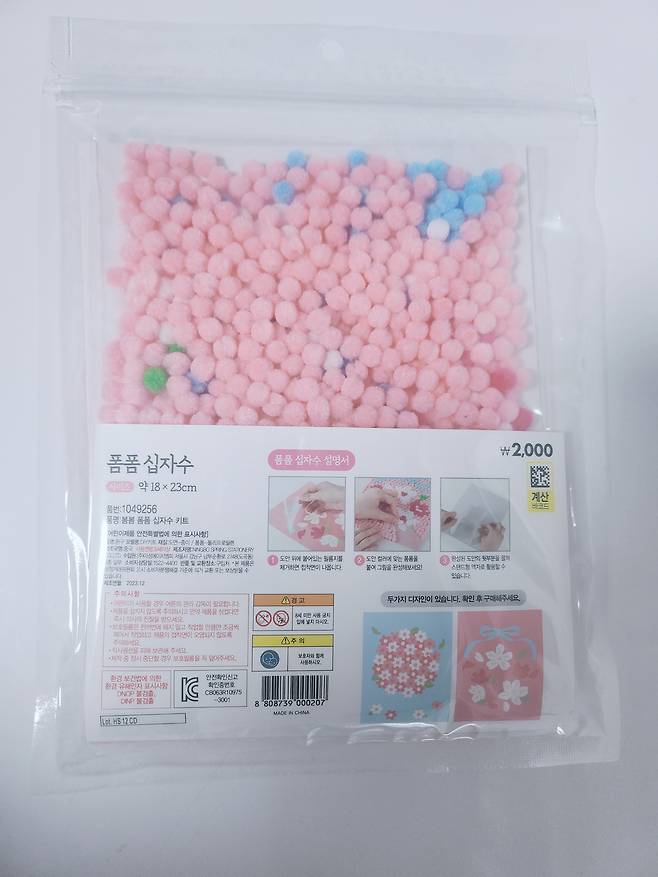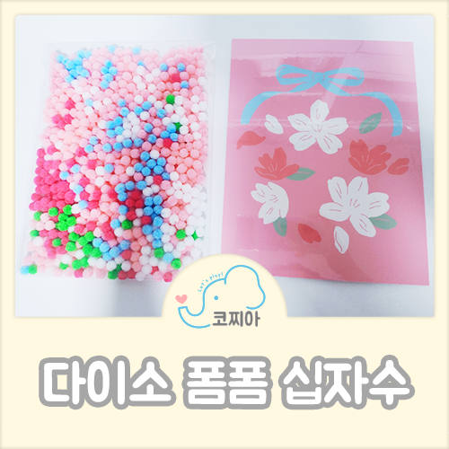 오늘 소개해드릴 놀이는 다이소 봄 만들기 시리즈 중 하나인 폼폼 십자수랍니다! 두가지 도안이 있었는데 저는 그중 분홍색 벚꽃 도안으로 선택해서 구매했어요. 평소 구매했던 DIY 상품은 대부분 1,000원이었는데 이건 2,000원짜리 상품이었답니다! 퀄리티가 괜찮아서 보자마자 구매했어요. 만들기 방법도 쉬워서 유아들도 쉽게 할 수 있을거라 예상해요!
