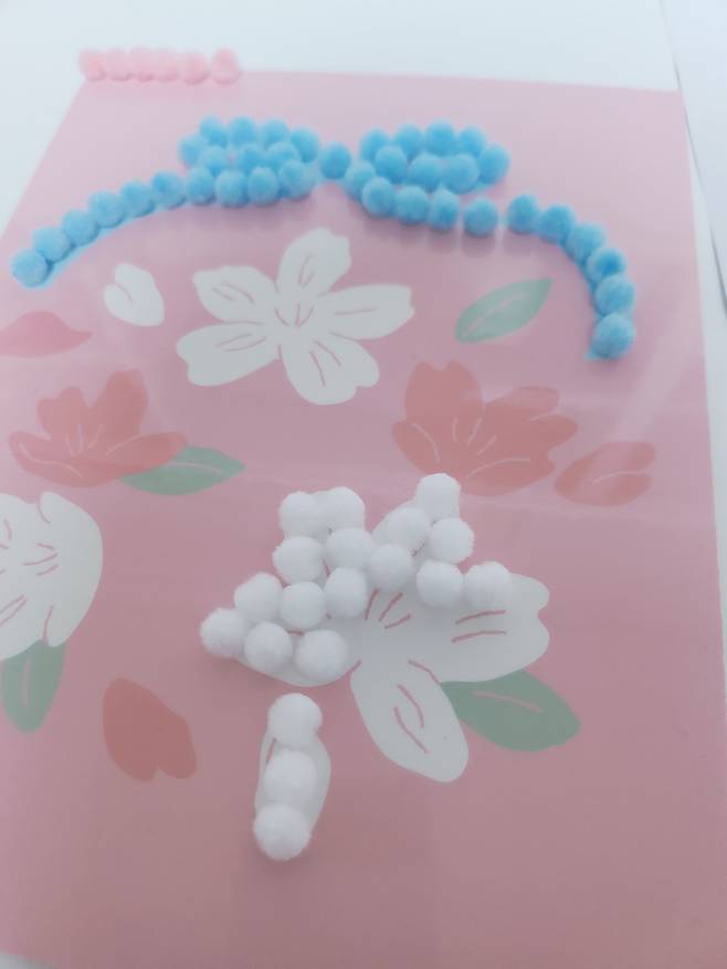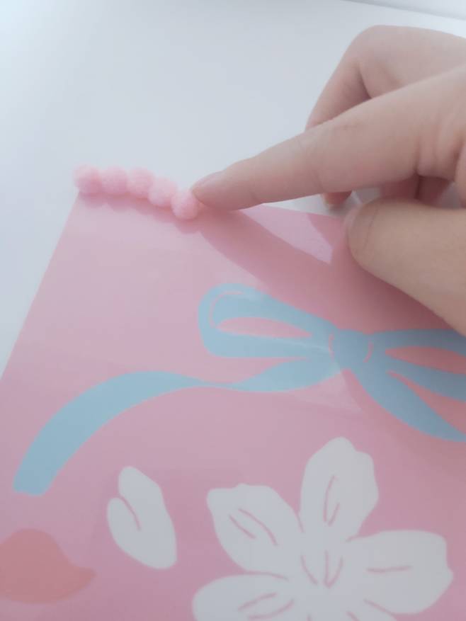 먼저 제일 많이 들어가는 분홍색 폼폼이부터 붙여보았어요.