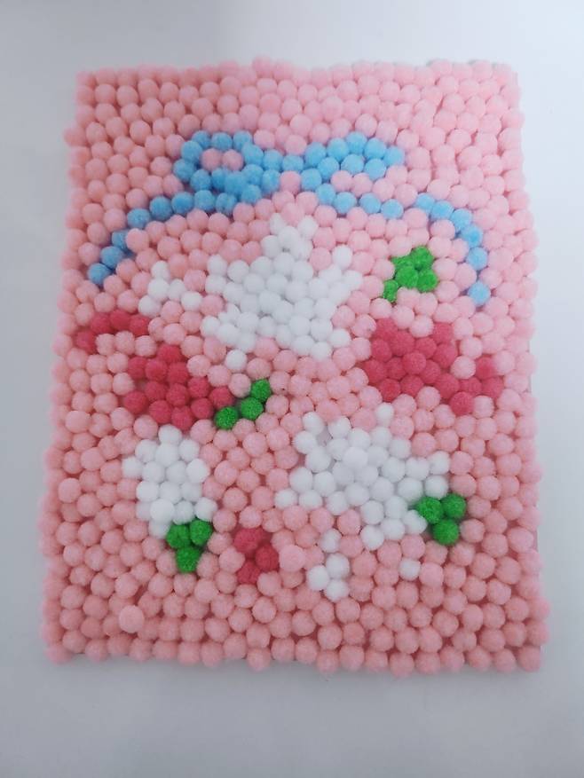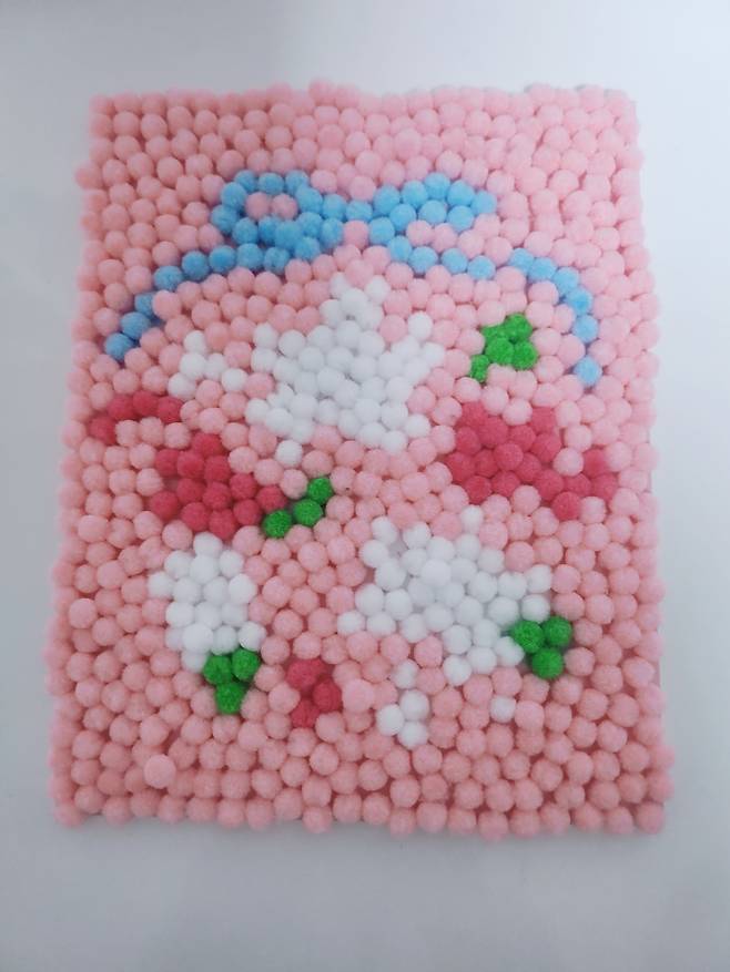 만드는 방법도 생각보다 간단하고 재미있긴 했는데 폼폼이를 붙이지 무슨 그림인지 잘 모르겠더라구요. 그리고 시간이 지나고 이걸 세워두면 폼폼이가 떨어지기 시작해서, 전시하실 목적이라면 OPP봉투에 넣어서 세우시는게 좋을 것 같아요.