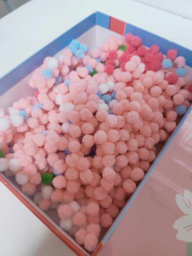 저는 폼폼이를 상자 뚜껑에 담아 사용했답니다. 폼폼이 크기가 작아서 영아들은 코나 입안에 넣을 수 있기 때문에 주의해야할 것 같아요. 안전하게 유아부터 사용하시기를 추천드려요!