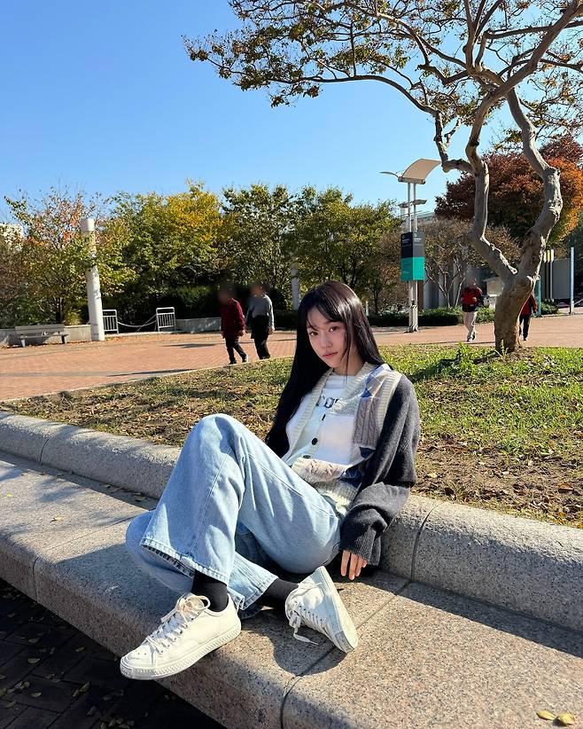 야외 벤치에 앉은 노윤서는 오버사이즈 그레이 가디건과 연청 와이드 데님 팬츠, 화이트 스니커즈로 편안한 데일리 룩을 완성했다. 니트 베스트와 자연스럽게 내려오는 긴 머리가 어우러져 청량하고 자유로운 분위기를 자아낸다. 여유로운 자세와 함께 내추럴한 스타일링이 인상적이다.