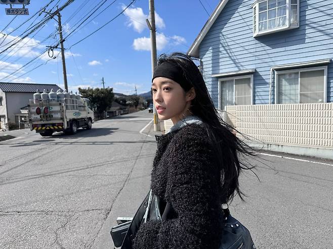 노윤서는 블랙 헤어밴드와 부클 소재의 블랙 재킷, 데님 셔츠를 매치해 스트리트 감성을 강조했다. 바람에 흩날리는 머리와 자연광이 어우러지며, 도시적인 배경과 조화를 이룬다. 심플하지만 존재감 있는 액세서리 활용이 눈길을 끈다.