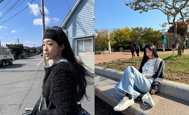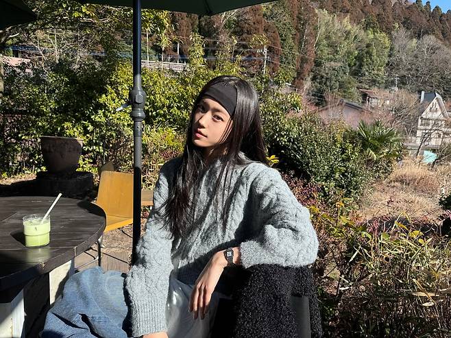 카페 테라스에서 포착된 노윤서는 그레이 니트와 와이드 데님, 블랙 아우터를 매치해 내추럴한 무드를 연출했다. 손목시계와 헤어밴드로 포인트를 더했으며, 햇살 아래 자연스럽게 드리운 머리가 전체적인 분위기를 부드럽게 완성한다.