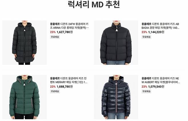 롯데온에서 판매 중인 몽클레르 14Y 제품. 비슷한 디자인의 성인용 제품 가격은 250만~400만원대로 2배 이상 비싸다. /사진=롯데온 화면 캡쳐