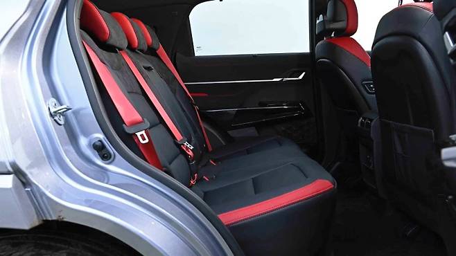 높은 차체와 넓은 유리 면적 덕분에 뒷좌석은 넓고 통풍이 잘 되는 느낌을 줍니다. 뒷좌석은 부드러운 패브릭 장식이 있으며, 32.5도까지 기울일 수 있고, 2단 열선 기능이 있습니다. 탑승자는 USB-C 충전 포트 두 개, 뒷창 블라인드 및 적당한 크기의 도어 빈을 이용할 수 있습니다. 또한 앞좌석 머리받침 뒤쪽에는 후크/폰 홀더가 있습니다.
