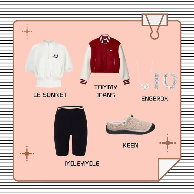 마지막은 편하게 산책 나갈때 입기 좋게이너로 르쏘넷 화이트 탑을 입어주고~포인트로 타미진스 크롭 바시티자켓을 입어주자!마일리마일 바이커쇼츠도 스포티한 무드를 주기에 좋은거 같아악세서리는 앵브록스랑 신발은 킨으로 귀엽게~~