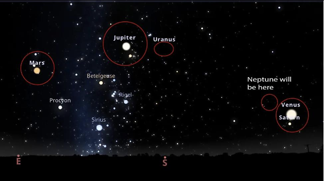 동서 방향으로 가로지르는 황도 위에 태양계의 6개 행성이 줄지어 떠 있는 희귀한 행성 정렬 현상을 관찰할 수 있다.