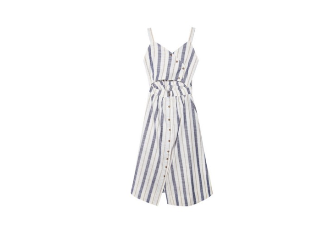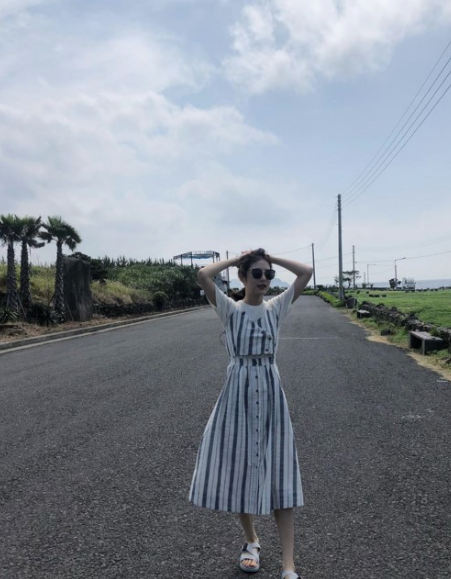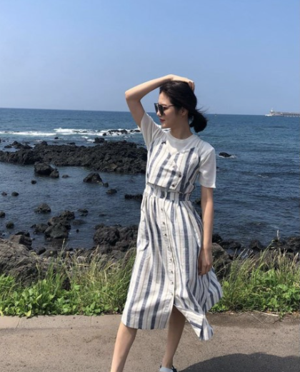 신예은은 흰색 티셔츠에 스트라이프 뷔에스타 원피스를 착용했고요. 선글라스에 샌들로 여행룩으로 딱 맞춤인 패션을 선보였어요.