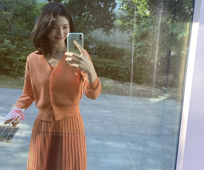 신예은은 오렌지 색상 의상으로 상큼하고 단아한 룩을 선보였습니다. 뷔에스타 슬리브리스 원피스에 가디건을 걸치면 청순한 룩을 완성할 수 있습니다.