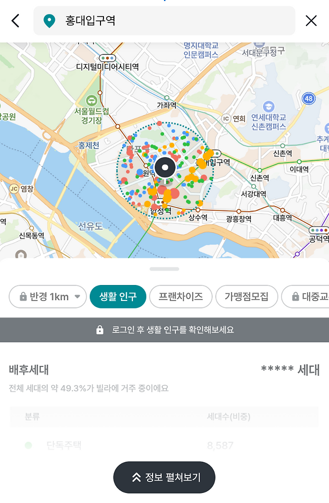 상권 분석을 위해서는 창업 플랫폼 ‘마이프차(myfranchise.kr)’의 활용을 추천드립니다. 카카오 계정으로 간편하게 가입하면 오피스텔, 아파트 등 주요 거주 형태는 물론, 연령대, 성별, 직장인구 등 상세한 인구통계학적 데이터를 확인할 수 있습니다.
