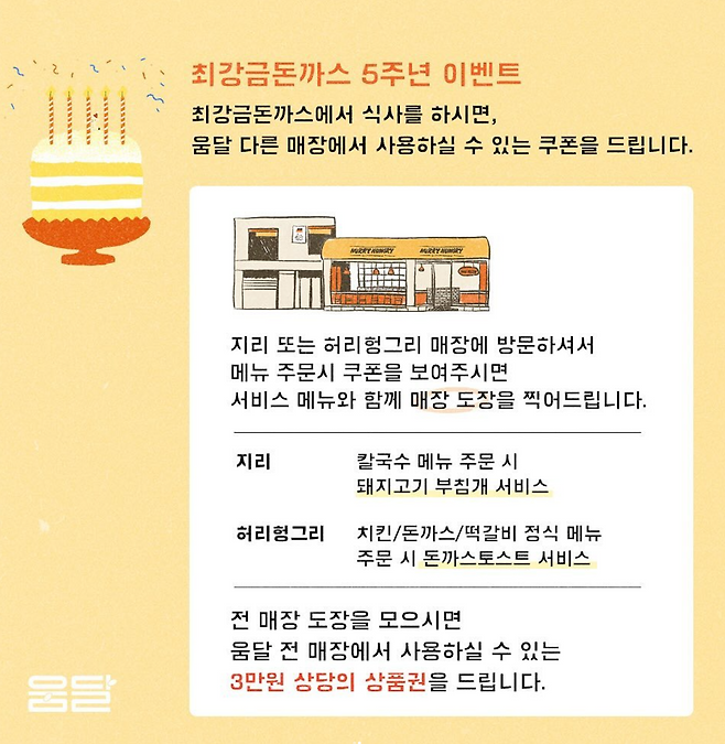 ‘최강금돈까스’는 5주년을 맞아 세 매장 모두를 방문한 고객에게 3만원 상품권을 제공하는 이벤트를 진행했습니다. 신뢰를 쌓은 브랜드가 새로 낸 매장이 자연스럽게 마케팅 시너지를 낼 수 있음을 보여주는 좋은 사례입니다.