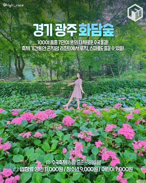 수국 감상과 함께 20여 종이 동물 체험과 승마 체험까지 함께 할 수 있어 하루를 꽉 채운 수국 나들이 명소로도 제격입니다. 게다가 올해는 정원 구석구석 아기자기한 포토존을 확대 설치하여 인생 사진도 남기기 좋습니다. 온라인 예약 시 승마 체험 패키지(29,000원)나 동물 먹이 세트 옵션도 제공됩니다.