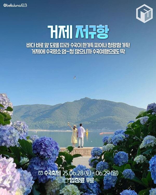 바다 바로 앞 해안도로를 따라 보랏빛, 푸른빛 수국이 만발해 청량감이 가득한 수국명소 거제 저구항입니다. SNS에서는 풍성한 수국 너머 반짝이는 바다가 액자처럼 자리한 각도가 포토존으로 유명하기도 한데요. 올해 수국 역시 힘차게 만개하고 있어 6월 말 경 가장 아름다운 풍경을 마주할 수 있을 것으로 보입니다.