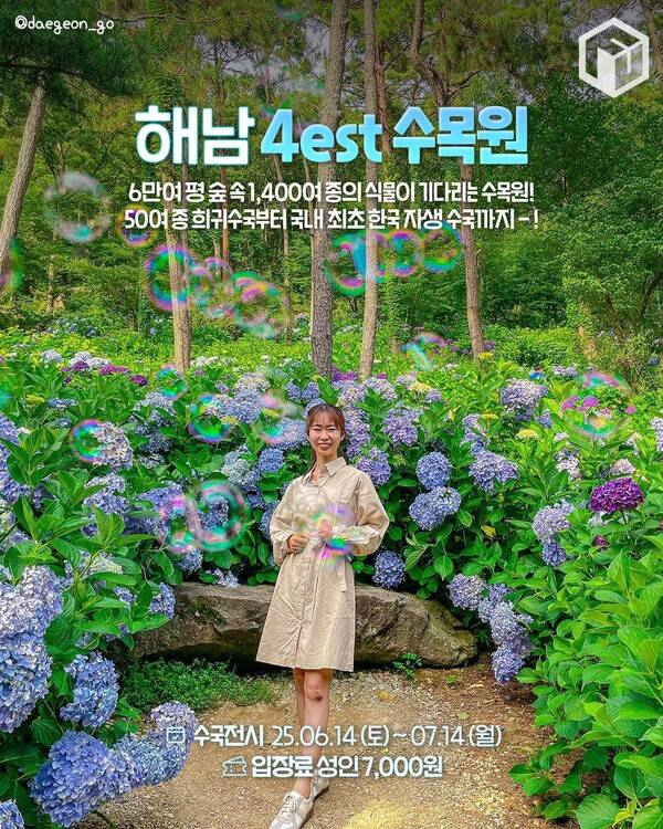 땅끝마을 해남에 위치한 4est수목원(포레스트수목원)은 약 6만여 평의 숲 속 1,400여종의 식물이 식재되어 있습니다. 수국 정원의 규모로도 국내 최대 규모를 자랑하는 것으로 잘 알려져 있는데요. 8,000여 그루에 달하는 수국은 희귀품종은 물론, 한국 자생 수국으로 구성돼있습니다.