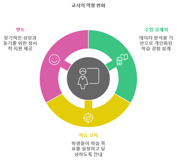 교사와의 협력 강화: AI는 교사에게도 실시간 데이터와 분석 결과를 제공하여 학생 개개인에게 맞춤화된 피드백을 제공할 수 있게 한다. 이는 교사가 학생들과의 상호작용을 보다 효과적으로 이끌고, 학습 과정에서 멘토로서의 역할을 강화할 수 있도록 돕는다. 이를 통해 교사와 학생 간의 협력과 상호작용이 강화되며, 학습의 질적 향상이 이루어진다.