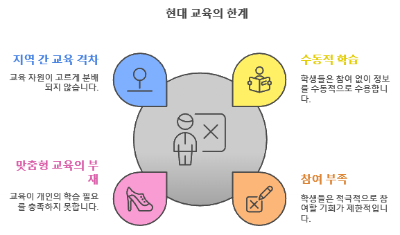 1. 수동적 학습 방식: 현재의 교육 시스템은 주로 교사가 주도하는 강의식 수업에 의존하고 있다. 이러한 방식은 학생들이 정보를 단순히 수용하는 수동적 역할에 그치게 하며, 창의적 사고력과 문제 해결 능력을 키우는 데 한계를 보인다. 학생들은 학습의 주체가 되기보다는 지식을 전달받는 객체로서 참여하게 되어, 학습에 대한 동기 부여가 부족하다.