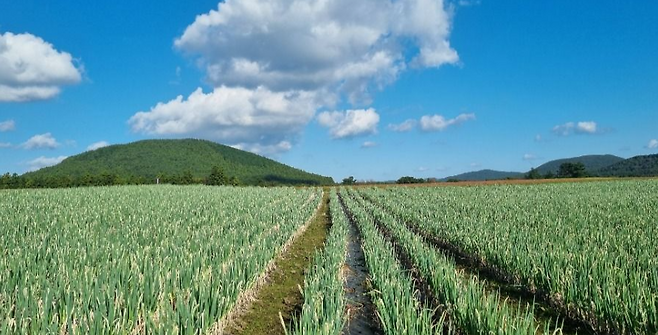 광활한 대파밭과 주변 경관이 어우러진 아름다운 풍경