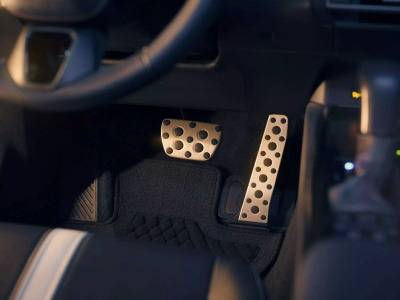 스포티한 스타일링은 실내에서도 이어집니다. 검은색 소프트텍스 시트에 흰색 대비 액센트를 적용하여 세련된 분위기를 연출했고, 알루미늄 페달과 패들 시프터가 포함된 가죽 스티어링 휠은 운전의 재미를 더합니다. 7인치 디지털 계기판, 8인치 인포테인먼트 시스템, 무선 스마트폰 충전기 등 편의 기능도 놓치지 않았습니다.