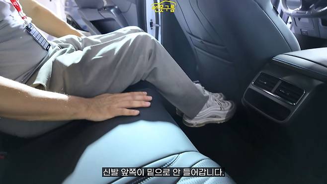 제가 앉은 자세 그대로 2열에 앉아보니, 1열 시트는 B 필러를 넘어섰음에도 불구하고 레그룸은 측정할 필요도 없이 매우 넓었습니다. 20cm가 훨씬 넘는 공간이라 다리를 꼬고 앉을 수도 있을 정도입니다. 다른 전기차에서도 비슷하게 나타나는 현상이지만, 2열 시트에 앉았을 때 허벅지 아래가 살짝 뜨는 점은 아쉬움으로 남았습니다.