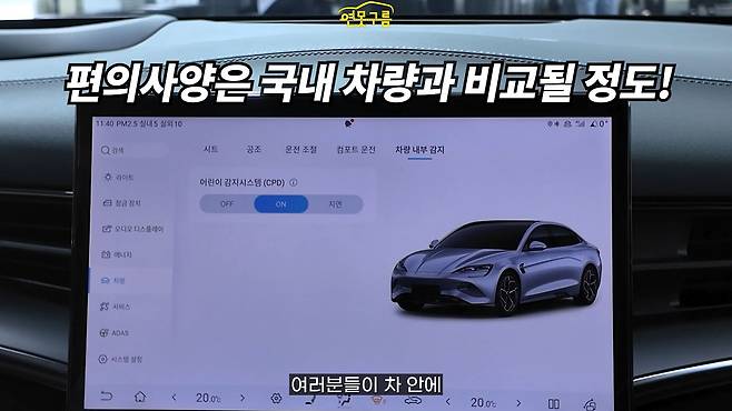 자동 와이퍼 기능 또한 운전 편의성을 높여주는 요소입니다. 차량 내부 감지 기능은 어린아이나 반려동물을 차 안에 두었을 때 감지하여 알려주는 시스템으로, 안전에 대한 BYD의 세심한 배려를 엿볼 수 있었습니다.