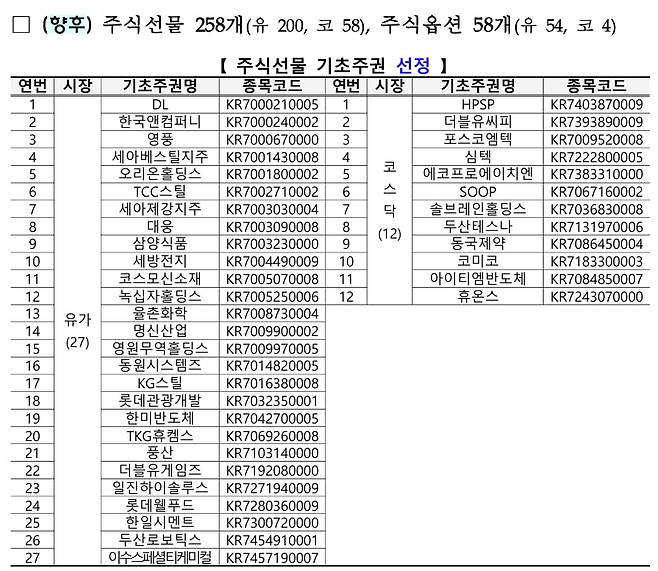 신규 상장되는 유가증권시장 주식선물의 기초주권은 한미반도체, DL, 한국앤컴퍼니, 영풍, 세아베스틸지주, 오리온홀딩스, 삼양식품, 코스모신소재, 율촌화학, 두산로보틱스 등 27개 종목이다. 코스닥시장에서는 HPSP, 더블유씨피, 에코프로에이치엔, 동국제약 등 12개 종목이다.