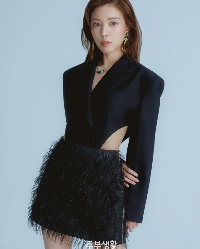 정시아는 요즘 유행하는 허리부분이 컷아웃 CUT-OUT된 올블랙 투피스를 완벽하게 소화해냈다.