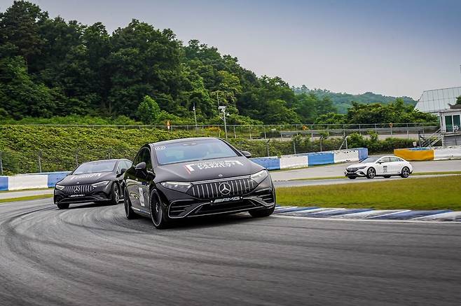 2일 경기 용인 AMG 스피드웨이에서 열린 메르세데스-벤츠 코리아 AMG EQ 익스피리언스 데이에서 현재 AMG 브랜드에서 내놓고 있는 대표 전기차종인 메르세데스-AMG EQS 53 4MATIC+(이하 EQS AMG)와 메르세데스-AMG EQE 53 4MATIC+(이하 EQE AMG) 등을 체험했다.