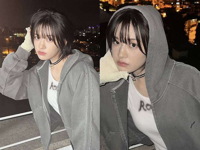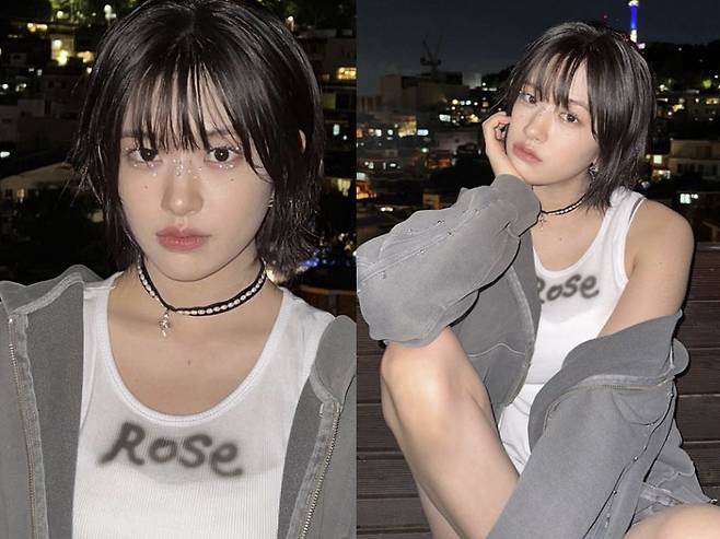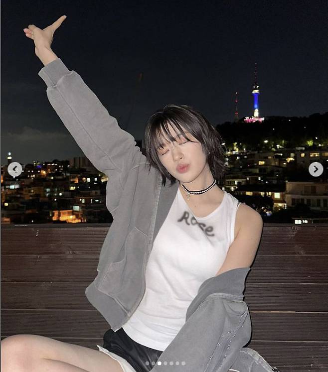 사진 속 안유진은 하얀 민소매 티셔츠에 반바지를 입고 오버핏 점퍼를 걸쳐 캐주얼한 패션을 선보이고 있다. 목에는 초커 목걸이로 포인트를 줘 시크한 스타일링을 완성했다. 하얀 피부와 대비되는 까만 단발머리가 시크한 매력을 더해준다.
