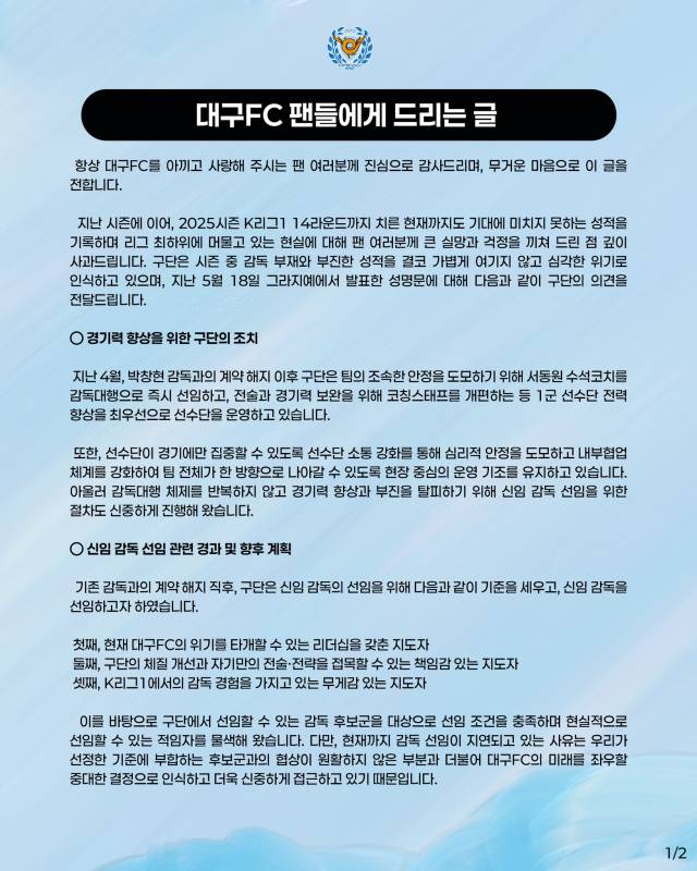 대구는 "리그 최하위에 머물고 있는 현실에 대해 팬들에게 사과한다. 구단 또한 감독 부재와 부진한 성적의 현 상황에 대해 심각한 위기라고 인식한다"며 "팬 여러분의 질책과 충언을 엄중히 받아들이고, 팀의 변화와 도약을 행동으로 보여드리겠다"고 각오를 밝혔다.
