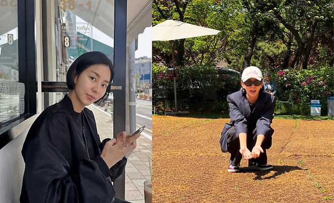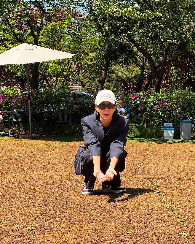 회색 후드 집업과 레깅스를 조합한 운동복 차림으로 활동적인 모습을 선보이고 있다. 화이트 캡과 선글라스로 포인트를 주어 단조로울 수 있는 운동복에 세련미를 더했다. 공원에서의 운동 중인 듯한 자연스러운 포즈가 건강하고 에너지 넘치는 이미지를 강조하고 있다.