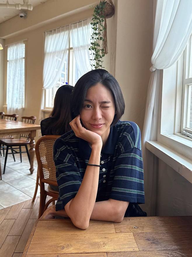 네이비 베이스에 그린 스트라이프가 들어간 니트 톱으로 깔끔하면서도 포근한 분위기를 연출하고 있다. 단정한 카디건 스타일의 니트는 클래식한 매력을 발산하며, 자연광이 들어오는 실내 공간에서 편안하고 여유로운 일상의 모습을 보여주고 있다