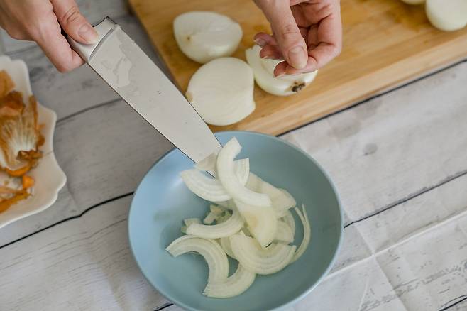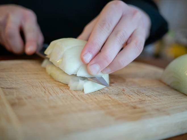 양파를 반으로 자른 후, 윗부분부터 슬라이스하거나 다지고 마지막에 뿌리를 자르는 방식이 도움이 됩니다.