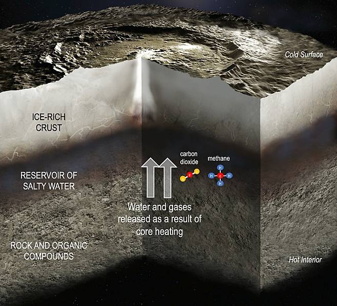 이어 "지금까지 세레스는 에너지원이 없어 생명이 존재하기 부적합하다고 생각됐지만 던의 탐사에서 과거 방사성 동위원소 붕괴로 열이 발생했음을 확인했다"며 "이 데이터를 바탕으로 컴퓨터 시뮬레이션을 진행한 결과, 세레스의 핵은 형성 직후부터 수억 년 동안 섭씨 280℃에 가까운 고온을 유지한 것을 파악했다"고 덧붙였다.