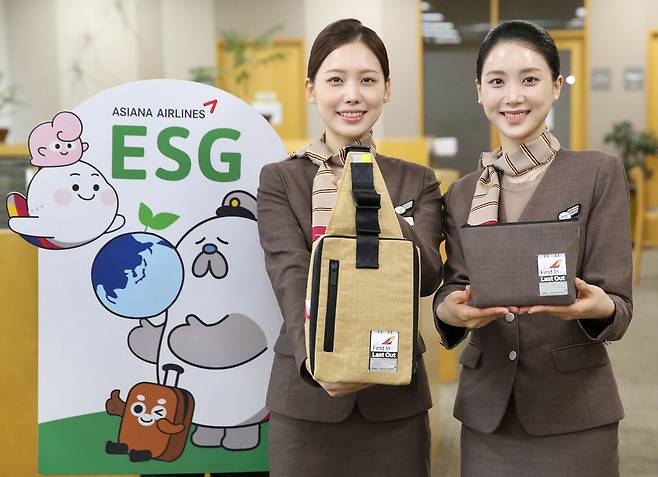 아시아나항공은 매년 버려지는 유니폼을 업사이클링 통해 재탄생시키는 방식으로 ESG 경영을 이어가고 있다. 폐유니폼을 가방과 파우치로 재탄생시켜 출시한 뒤 판매 수익금 전액은 소방관 복지단체에 기부했다.