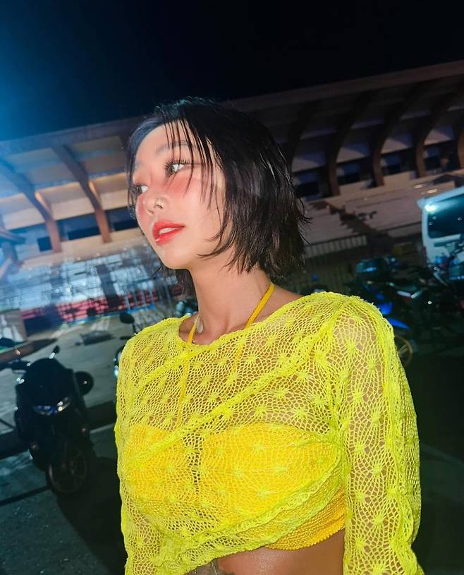 • 크로쉐탑: 효린이 선택한 크로쉐탑은 단순한 여름 니트가 아니었어요. 시스루 소재를 믹스매치해서 #페스티벌룩 의 정점을 찍었죠. 톡톡 튀는 형광 옐로우 컬러는 여름에 찰떡! 💛