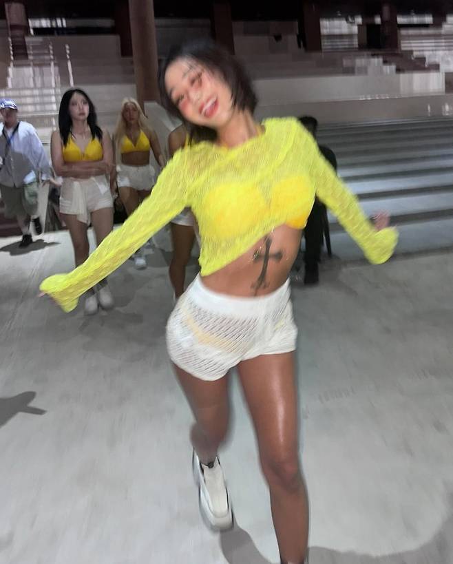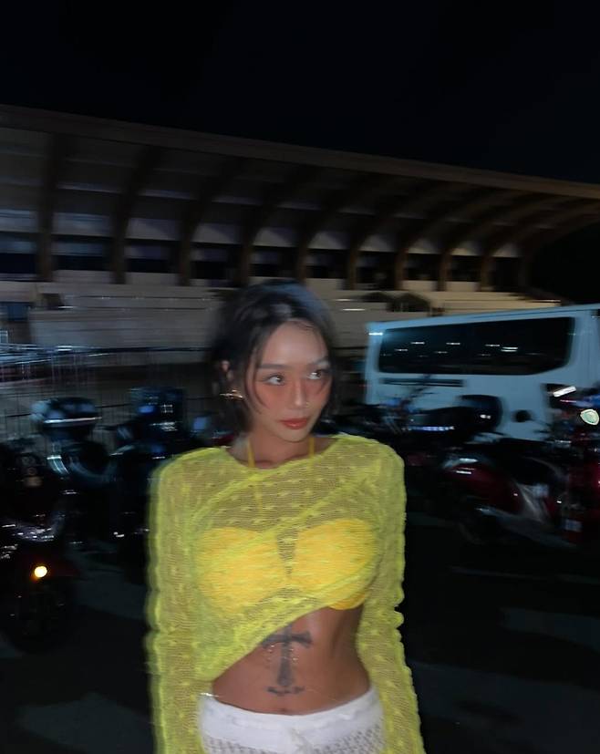 • 포인트: 웜톤 피부에 건강한 윤기는 기본! 복부에 새겨진 크로스 타투는 룩 전체에 🔥센 언니🔥 바이브를 더했어요. 😎 타투 is 뭔들!