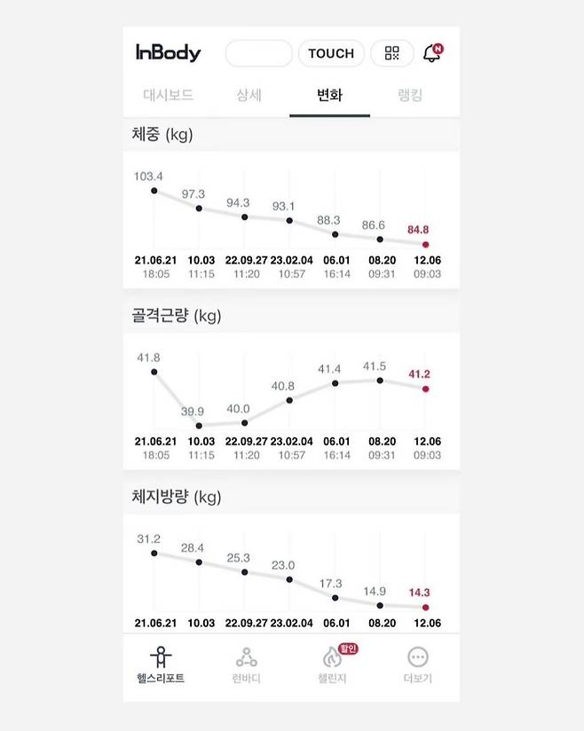 공개된 결과를 보면 스윙스는 2021년 6월 몸무게 103.4kg에서 지난 6일 84.8kg까지 감량하는데 성공했다. 체지방 역시 31.2kg에서 14.3kg까지 줄었다.