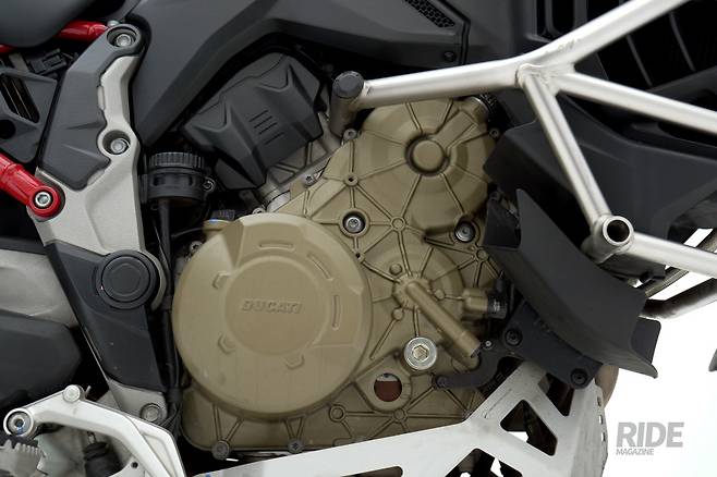 멀티스트라다 V4 시리즈에는 V4 그란투리스모 엔진이 탑재되어 최고출력 170마력/10,500rpm, 최대토크 125Nm/8,750rpm의 성능을 낸다. 파니갈레 V4 시리즈나 스트리트파이터 V4 시리즈에 탑재된 데스모세디치 스트라달레 엔진과는 추구하는 방향성이 다른데, 가장 큰 차이는 역시 흡배기 밸브의 방식이다. 두카티의 상징처럼 여겨지는 강제 개폐식 밸브 데스모드로믹이 적용된 데스모세디치 스트라달레 엔진은 동급 대비 더 높은 영역까지 엔진을 회전시킬 수 있어 그만큼 더 고성능을 발휘할 수 있는데, 대신 24,000km마다 주기적인 점검이 반드시 이뤄져야 제성능을 유지할 수 있다. V4 그란투리스모 엔진은 대신 스프링 리턴 방식의 밸브를 적용해 성능 수치는 낮지만 훨씬 긴 60,000km의 점검 주기를 갖기 때문에 부담을 크게 덜어준다.