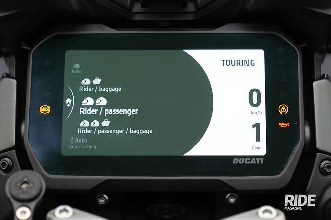 시트에 앉으면 큼직한 계기판이 눈길을 사로잡는다. 6.5인치 풀 컬러 TFT 디스플레이는 각종 주행정보는 물론이고 차량 설정을 표시한다. 앱을 이용해 차량에 스마트폰을 연동시키면 스마트폰 화면을 계기판에 그대로 보여주는 미러링 기능까지 탑재하고 있지만 아쉬운 건 차량 연결을 위한 두카티 커넥트 앱과 별도의 전용 지도 앱을 사용해야 한다는 점이다. 기왕이면 USB 포트를 활용해 스마트폰 화면을 그대로 보여주는 일반적인 미러링 기능을 탑재해줬으면 더 좋지 않았을까 싶다. 그래도 기본적으로 스마트폰과 인터컴을 차량에 블루투스로 연결하면 음악 제어, 전화 송수신, 배터리 상태 확인 등 기본적인 기능들은 사용 가능하다.