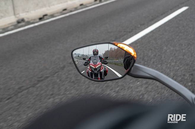 차량의 기본 성능을 확인했으니 이제 본격적인 주행보조 기능에 대해 살펴볼 차례다. 이미 그 전부터 한 가지 기능은 계속 작동하고 있었는데, 바로 사각지대 감지 기능이다. 주행 중 좌우 차선 후방에서 주행하는 차량이 있으면 사이드미러 상단의 램프를 통해 존재를 알려주고, 차선 변경을 위해 방향지시등을 켰을 때는 위험한 상황임을 알리기 위해 빠르게 램프가 깜빡인다. 모터사이클이 차체가 작아도 사각지대가 분명 존재하는 만큼 숄더 체크가 습관화되지 않으면 자칫 사고가 날 수 있는데, 이 기능이 사고를 방지해주기 때문에 특히 시내에서 안심하고 주행할 수 있다.