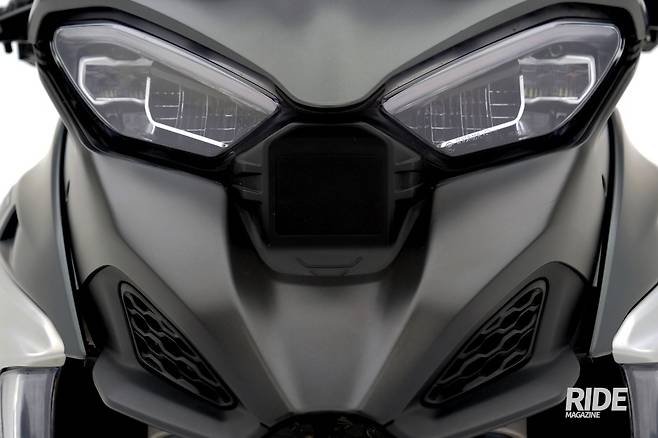 전면부에선 2안식 LED 헤드라이트도 눈길을 끌지만, 이보다 관심이 가는 건 헤드라이트 사이에 위치한 사각의 물체일 것이다. 바로 이것이 멀티스트라다 V4 S의 주행보조 기능에서 중요한 역할을 하는 레이더 센서다. 이 센서는 후면 제동등 하단에도 배치되어 전후의 상황을 감지하는 역할을 한다. 자동차에서야 자주 보던 기능들이지만 모터사이클에선 어떻게 작동할지 아직까진 생소하다.
