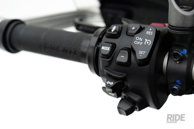 좌측 핸들바에 버튼이 많은데, 차량 정보 설정을 위한 레버 겸 스위치, 그리고 서스펜션과 주행모드 설정을 위한 버튼이 있고, 자동차 운전자라면 눈에 익은 아이콘의 버튼도 있다. 바로 주행보조 기능 중 하나인 어댑티브 크루즈 컨트롤(ACC)을 위한 기능 조작 버튼이다. 기능을 작동시키고 속도를 설정한 뒤 +. - 버튼으로 차간 거리를 4단계 중 하나로 세팅하면 된다. 그러면 준비는 끝. 어떻게 작동할지 궁금해 얼른 시승에 나섰다.