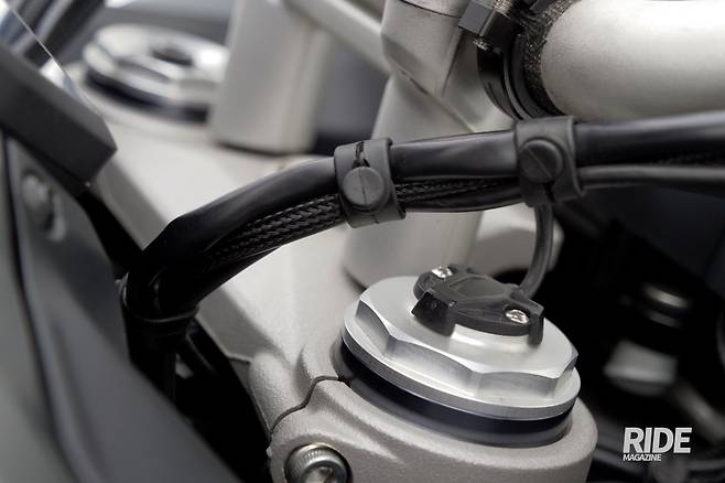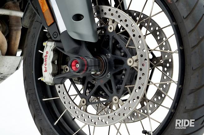 브레이크는 세밀한 조작이 필수다. 앞에 브렘보 스타일레마 캘리퍼가 좌우 양쪽으로, 뒤에 브렘보 2포트 캘리퍼가 장착되고 브렘보 마스터 실린더가 더해져 강력한 성능을 발휘하기 때문. 큰 힘을 들이지 않아도 강력한 제동력이 발휘되지만 균일하게 발생해 이해하기 수월하다. 여기에 코너에서 제동 시 라이더가 원하는 라인을 그릴 수 있도록 제동력을 세밀하게 조절해주는 주행 보조 기능인 코너링 ABS도 더해져 안심하고 주행할 수 있다.